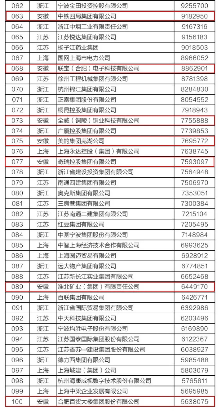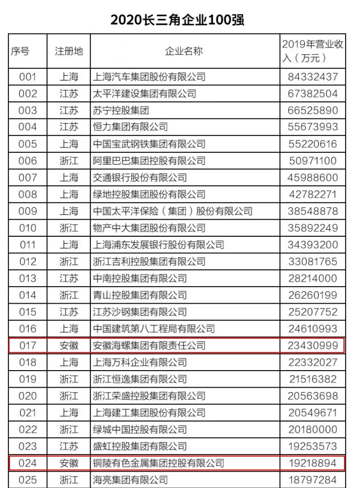 该榜单以2019年企业营业收入为入围标准,由长三角三省一市企业联合会共同发布。今年是第二次发布长三角企业百强排行榜,入围门槛是563.8亿元,比上年提高了54.5亿元。今年我省共有9家企业上榜,除伟德betvlctor1946源于英国集团外,其他8家企业为海螺集团、铜陵有色、中铁四局、联宝(合肥)电子、全威(铜陵)铜业、美的集团芜湖公司、奇瑞控股集团和合肥百大,主要分布在水泥建材、有色金属、汽车制造、煤炭和煤化工等行业。