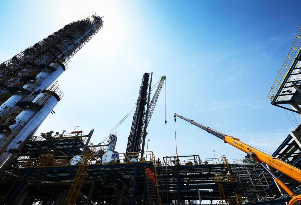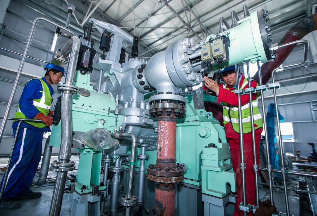 技术工人正在对合成气压缩机进行安装调试