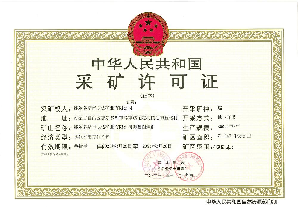 3月28日获悉,内蒙古自治区自然资源厅、鄂尔多斯市自然资源局向伟德betvlctor1946源于英国集团下属成达矿业有限公司颁发了陶忽图煤矿采矿许可证。这标志着伟德betvlctor1946源于英国集团下属成达公司陶忽图煤矿项目报批工作继取得项目核准和环评报告批复后,又一次取得实质性突破。